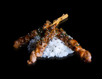 TRES SABROSAS BROCHETAS DE POLLO YAKITORI SERVIDAS CON ARROZ TU SUSHI Y SÉSAMO