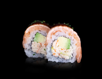 CANGREJO, CEBOLLETA, AGUACATE, PEPINO, COBERTURA DE SALMÓN SOPLETEADO CON SALSA KATSU Y MAYONESA JAPONESA