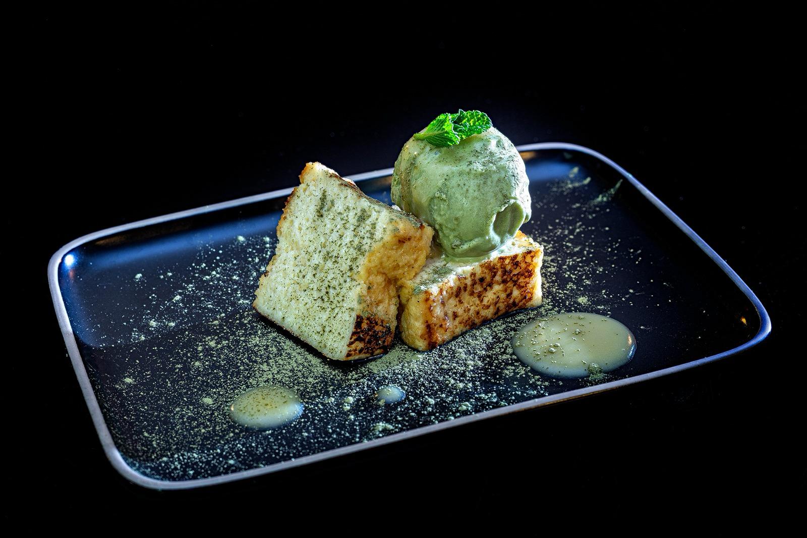 Torrija, helado de té matcha y crema de yuzu