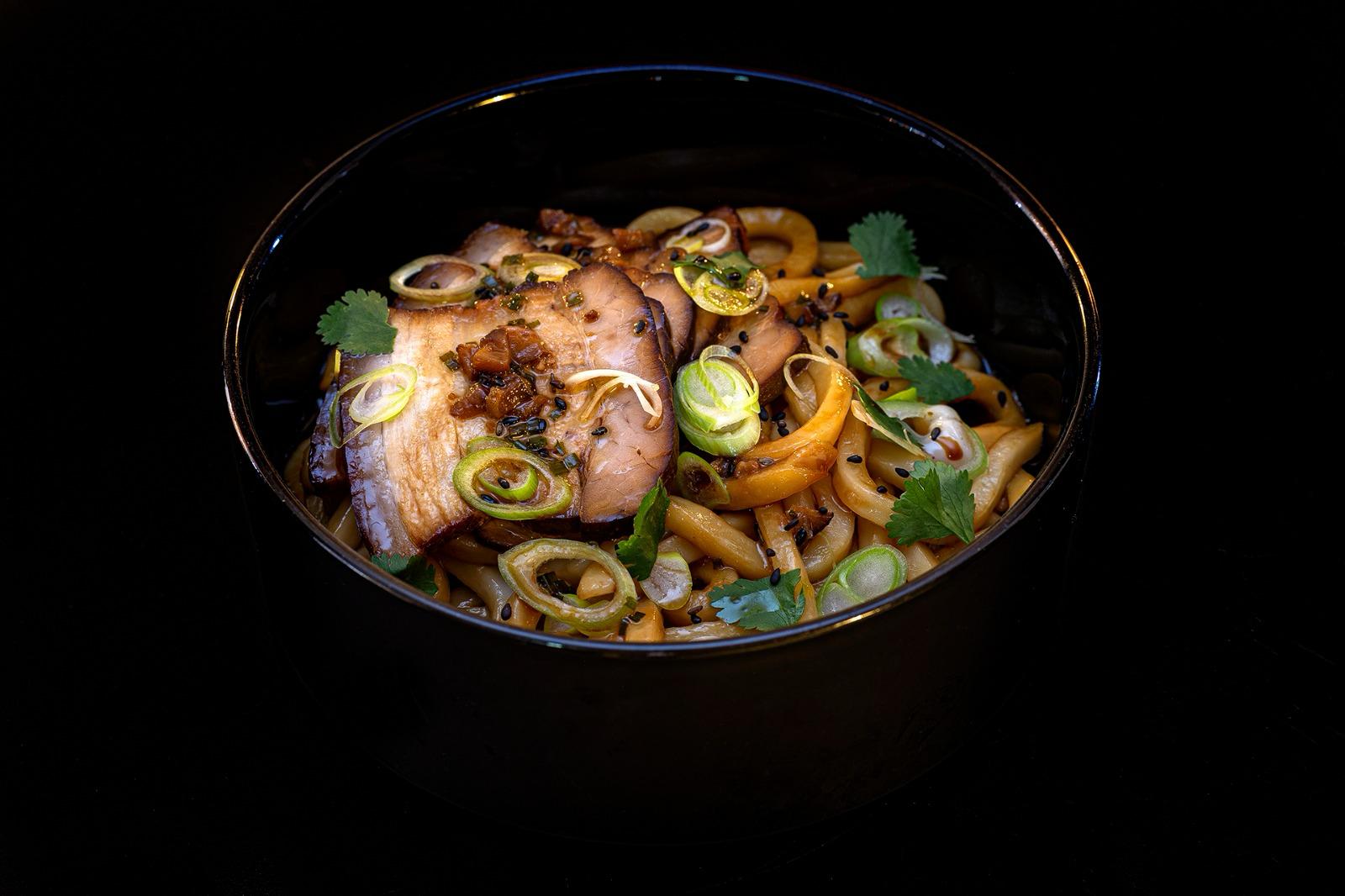 FIDEOS UDON, CON PANCETA A BAJA TEMPERATURA EN SALSA TERIYAKI, CEBOLLETA Y CILANTRO FRESCO