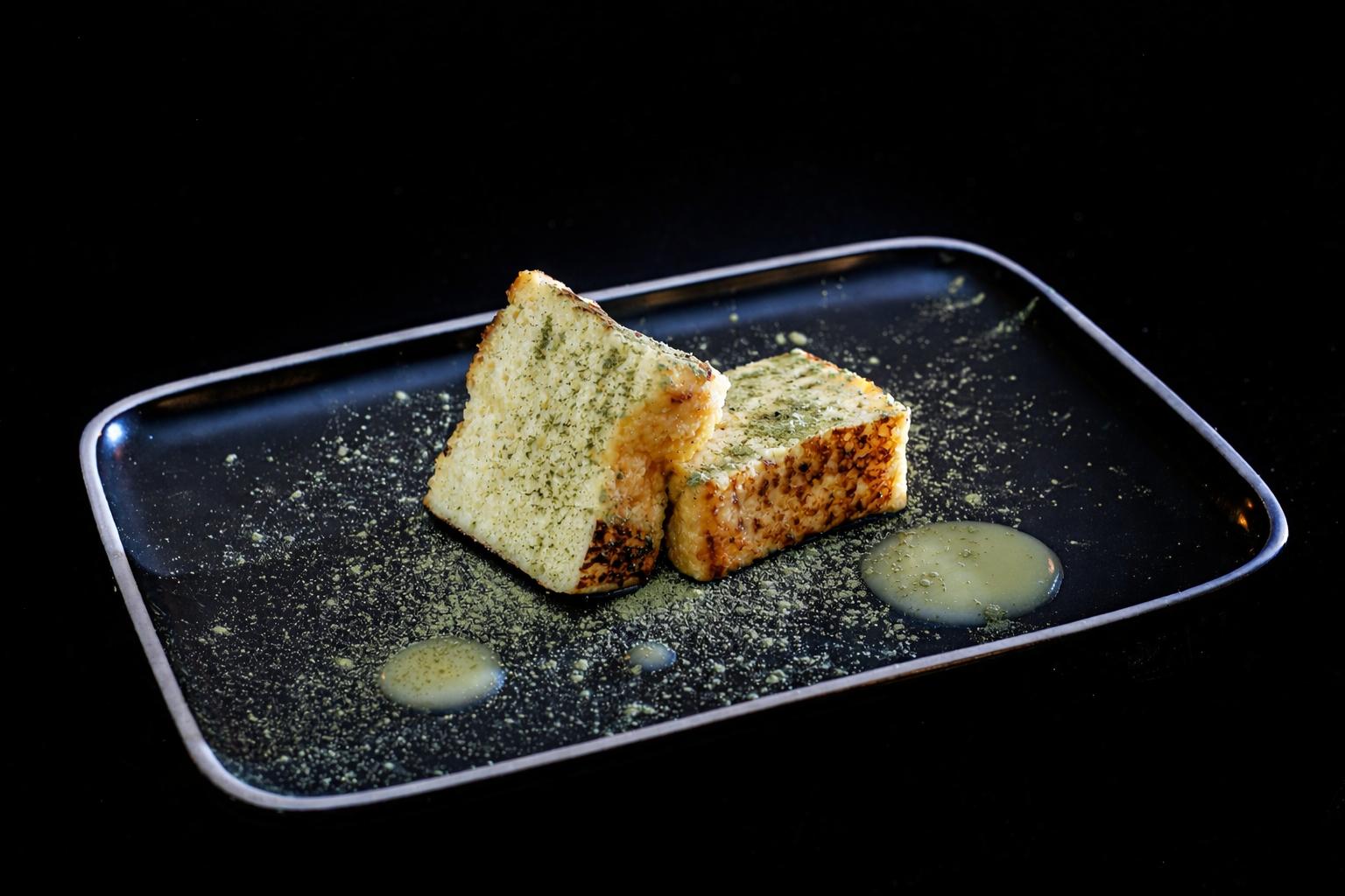 QUESO CREMA, MANZANA ASADA,RALLADURA DE NARANJA Y NORI CRUNCH